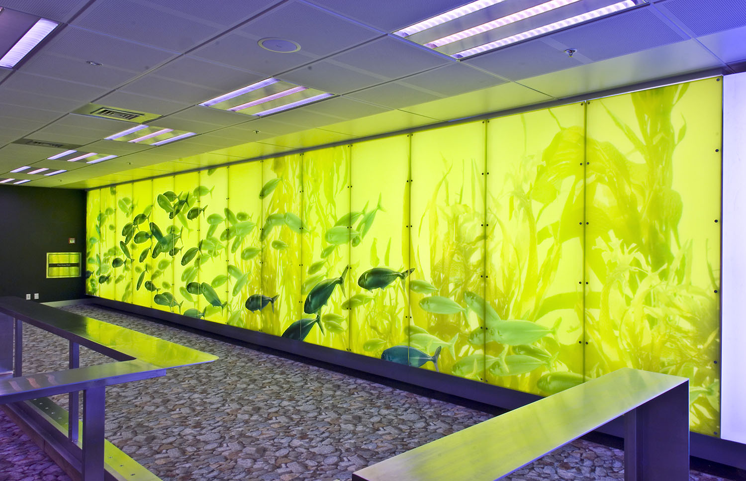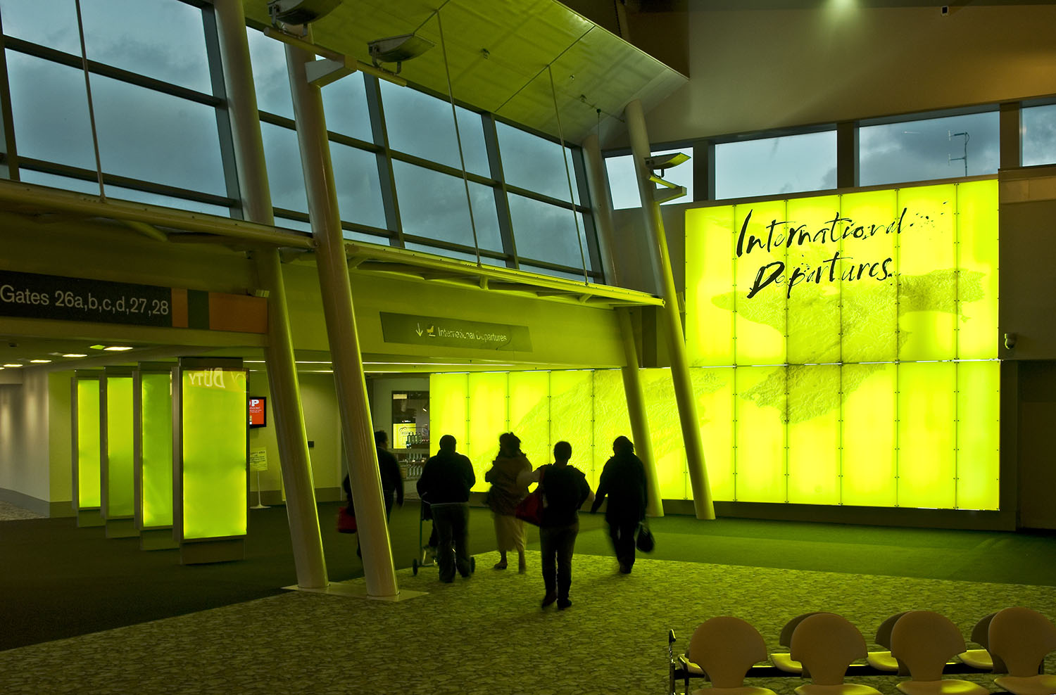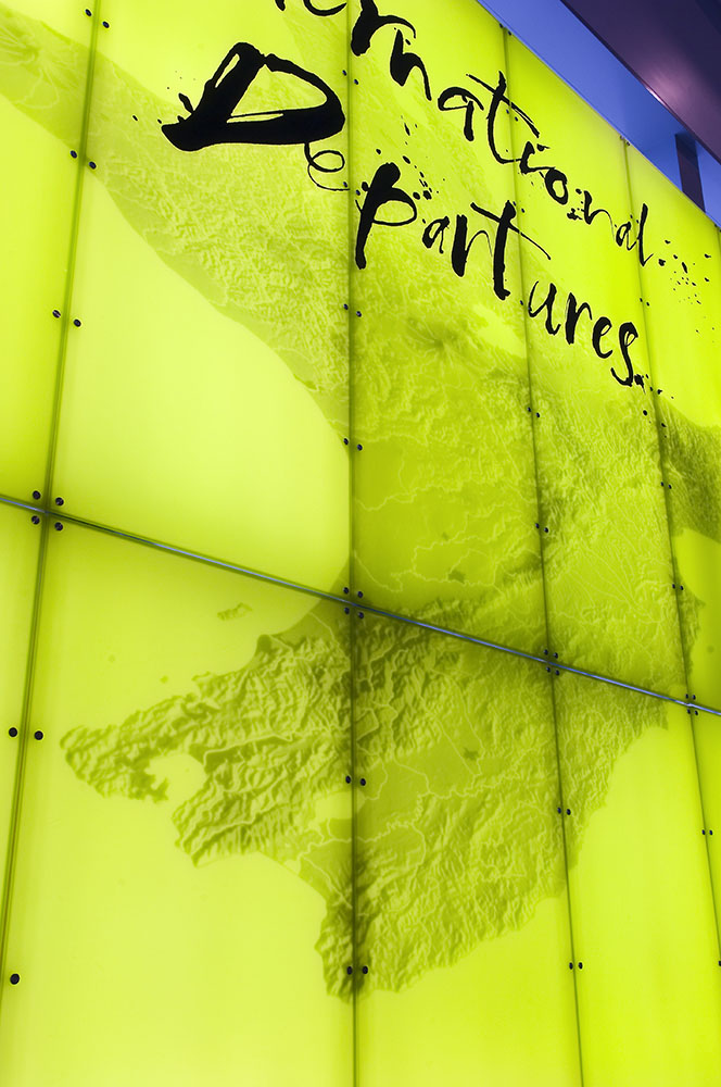 The layout of the terminal was rationalised to create clear navigation pathways. A new entry point into the expanding queue area was created, with a double-height illuminated wall in brilliant yellow-green used to aid intuitive way finding. Functioning as a linking device throughout the refurbished area, the new carpet, with a pattern of pebbles inspired by the nearby rocky Wellington south coast foreshore, ties in with the aquarium and the graphic theming of the illuminated wall.